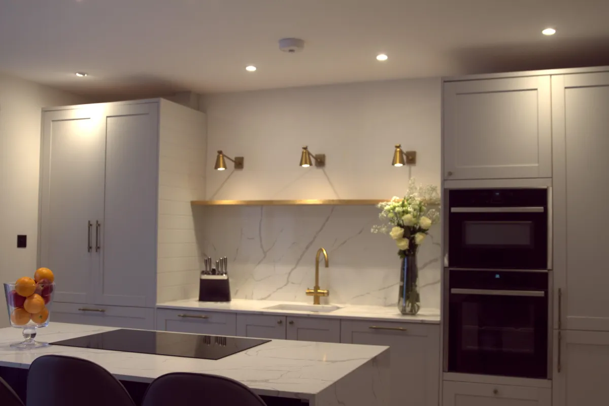 The material palette—oak floors, soft greys and whites, brass accents creates a calming, timeless atmosphere.